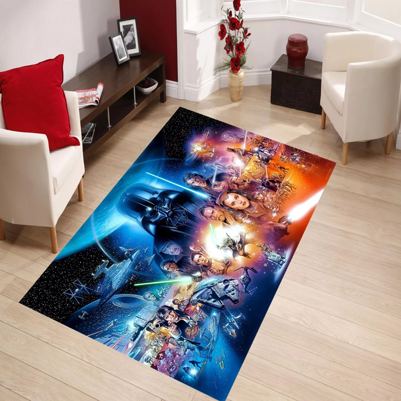 The star wars area rug star wars carpet bedroom rug outdoor rug is designed with 3 layers, flannel composite sponge rug, a middle foam layer, and non-slip plastic dots on the bottom made of non-woven fabric to enhance water absorption. With a thickness of 1.2 cm, it is durable and woven and dyed using advanced technology, resulting in a soft texture.